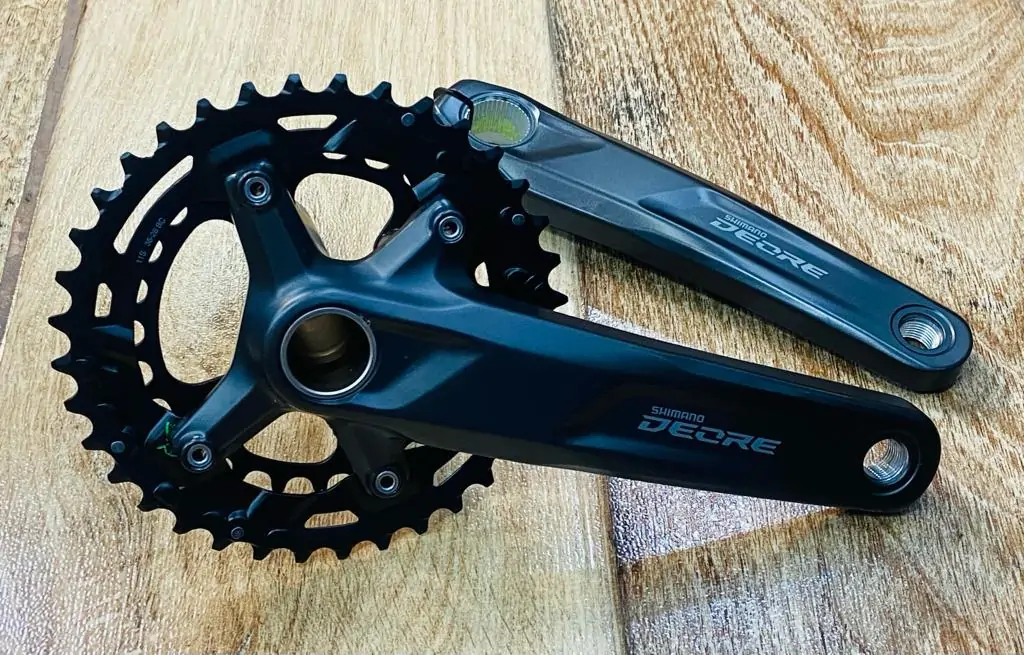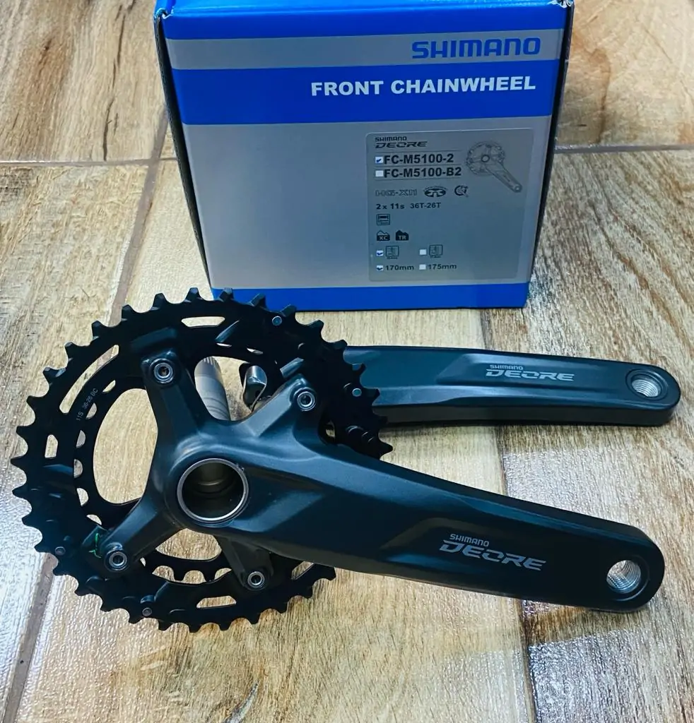 Las bielas para bicicleta de montaña SHIMANO DEORE FC-M5100-2 proporcionan un cambio preciso y fiable para transmisiones de 2×11 velocidades. Esta biela de 2 piezas ofrece una combinación de cambio 36-26D y una línea de cadena de 48,8 mm.